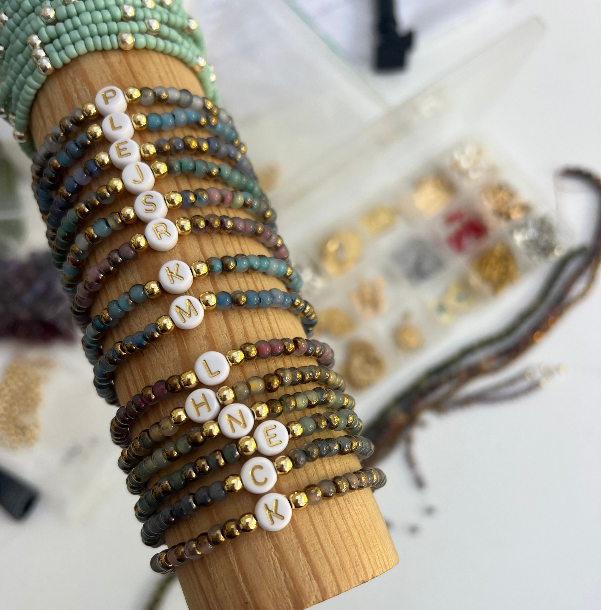 Customisable bracelet with gold letter beads, handmade in Leigh-on-Sea, Essex.